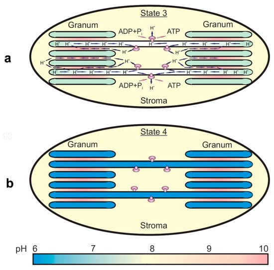 A sketch, illustrating the appearance of the nonuniform lateral profile of ΔpH, is shown in Figure 5. The leakage of protons from the lumen through the ATP synthase complexes of stroma-exposed thylakoids would cause a less significant decrease in ΔpH established across the membranes of the stromal thylakoids compared with ΔpH established across the membranes of granal thylakoids (Figure 5a). A hindrance to the long-range lateral diffusion of H+ ions from the lumen of granal thylakoids to the ATP synthases would provide the establishment of the lateral gradient of protons along the chloroplast lamellas. If the ATP synthase complexes are inactive, a proton equilibrium between the lumens of grana and stromal thylakoids would be established (Figure 5b). A mathematical model described in [] supports the notion that the restrictions to the long-range obstructed diffusion of protons inside the lumen could influence the lateral profiles of ΔpH along the thylakoid membranes. The model predicts the establishment of nonuniform lateral profiles of ΔpH under the photophosphorylation conditions and significant alkalization of the inter-thylakoid gap. Theoretical analysis of the problem suggests that the hindrance to the long-range diffusion of protons inside the gap is due to significant alkalization of the inter-thylakoid gap (for details, see [] and references therein).