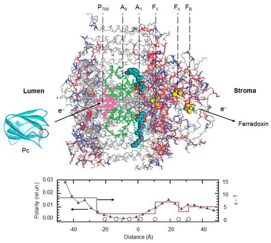 The electrometric data revealed a notable variation in the dielectric properties of PSI in the normal direction to the membrane plane: the polarity was found to be lower in the middle of the membrane than at its edges []. Figure 6 shows the profiles of polarity and dielectric permittivity (ε) along the PSI complex. For the hydrophobic core of the complex, a low value of ε equal to 3.5 was accepted. The pattern of dielectric permittivity obtained by the electrometric data correlates strongly with the polarity of the PSI molecular structure. The microscopic polarity has a wide minimum in the middle of the membrane around the accessory chlorophyll A0 (approximately between the chlorophyll dimer P700 and the phylloquinone molecules A1) and gradually increases toward both edges of the complex. In the acceptor part of the PSI, the pattern of polarity reveals a maximum between 4Fe4S clusters FX and FA and a local minimum between FA and FB. The profile of protein polarity is in qualitative agreement with the dielectric profile (red line in Figure 6, bottom panel) obtained via electrometric measurements.