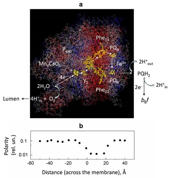 Panel (a): Distribution of relative polarity in PSII. The 3D structure of the PSII complex (PDB code: 2axt). The protein atoms are colored according to their local polarity: red, white, and blue colors correspond to low, intermediate, and high values of polarity, respectively. The polarity degree was calculated as the number of polar groups of protein side chains and hetero atoms localized within the sphere of 7 Å radius divided by the total number of heavy atoms within the sphere. Redox cofactors are colored yellow. Abbreviations: PQA and PQB, primary and secondary plastoquinones; PheD1 and PheD2, pheophytin molecules associated with the protein subunits D1 and D2 of PSII; P680, special pair of chlorophyll molecules; YZ, redox-active tyrosine; Mn4CaO5, water-oxidizing manganese cluster. Panel (b): Polarity profile averaged for the structure shown in (a). The polarity profile marked by black circles along the ‘‘distance’’ axis correlates with the 3D structure shown in Figure 7a. Figure 7 is adapted from [], with permission.