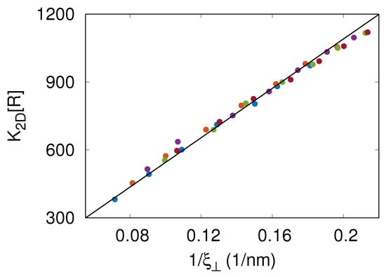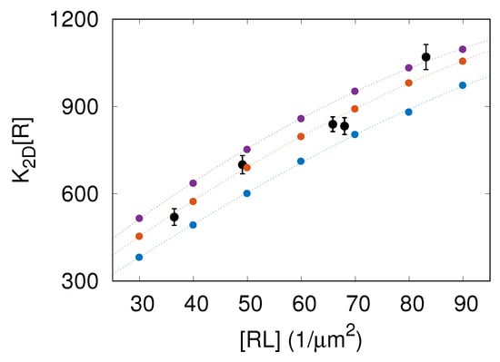 Two-dimensional binding affinity times the area concentration of receptors, , versus the average area concentration of receptor–ligand complexes. The data points in black correspond to the experimental FRAP data taken from Figure 2A in Reference [9]. The points in blue, orange, and purple represent the results of MC simulations with , and nm, respectively. The dashed lines are to guide the eye.