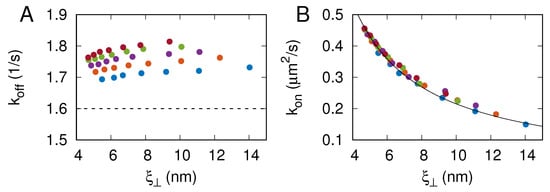 MC simulations with local moves can be used to study membrane dynamics in the overdamped limit [23,25]. Here, we keep track of receptor–ligand binding and unbinding events in the course of the MC simulations. The maximum likelihood method used to extract the binding rate constants and from the MC simulation trajectories is detailed in Section 2.2. Figure 4A shows that the values obtained from the simulations are in the range between and s. These values indicate that the off-rate is reaction-limited because , where is the simulation step time and is the depth of the receptor–ligand binding potential given by Equation (2). Importantly, the values obtained from the simulations compare well with s measured in surface plasmon resonance experiments [14], which additionally validates our computational model because no kinetic information is incorporated into the construction of the model.