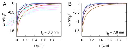 Potential of mean force , where is the two-dimensional pair correlation function for receptor–ligand complexes. Panels (A,B) correspond to nm and nm, respectively. The lines in orange, red, purple, and blue correspond to 30, 50, 70, and 90 receptor–ligand complexes per square micron.