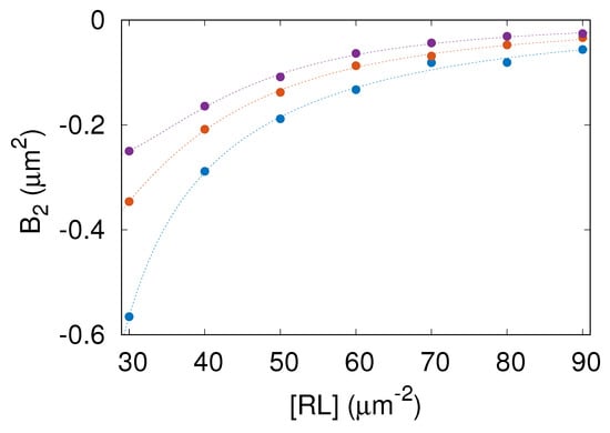 Second virial coefficient, , as a function of the area concentration of the receptor–ligand complexes, , computed for nm (blue), (orange), and (purple). The color code and symbols are as in Figure 2.