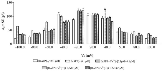 In all experiments, before peptide addition, the PLM was stabilized using voltages of ±80 and ±100 mV consecutively for 10 min each. During the membrane’s stabilization phase, the conductance and capacitance remained at constant values of 26 pS and 0.30 µF/cm2, respectively, and no channel activity appeared. After the membrane stabilization step, the addition of the peptide solution or the peptide–calcium mixture was carried out at the voltage of 100 mV (addition voltage). After different lag times, which depended on the experimental conditions in the different sets, the channel activity of hIAPP was observed at an activation voltage of 100 mV as abrupt, discrete, nonrandom current jumps from the baseline current, consistent with the finding of our previous study [40]. The channel activity alternated with periods of quiescence and periods of paroxystic activity whose duration depended on the experimental conditions, as will be discussed in what follows. In the initial phase of hIAPP incorporation into the PLM and during the period of paroxystic activity, current transitions directed upward were more frequent than those directed downward. By applying the same experimental protocol used in our previous study [40], the channel activity was monitored in the range of applied voltages from ±20 to ±100 mV. Briefly, after the appearance of the first channel, the applied voltage was lowered as far as ±20 mV, and the channel amplitude was recorded on the chart recorder. Each voltage was applied for 90 min starting at 100 mV, and then 90 min at −100 mV, and so on.