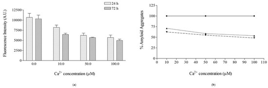 hIAPP amyloid aggregates levels in the absence and presence of different concentrations of CaCl2. (a) Fluorescence intensity was measured after 24 and 72 h of incubation in PBS pH = 7.4 at 37 °C. (b) Percentage values of the fluorescence intensity of hIAPP (10µM) in the absence (●) and in the presence of the three Ca2+ concentrations after 24 h (▲) and 72 h (▼) incubation.