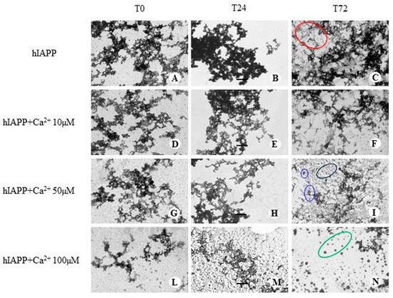 The morphology of hIAPP aggregates, both in the absence and presence of Ca2+, was evaluated using TEM. hIAPP (10 µM) was incubated alone or with 10, 50, and 100 µM CaCl2 at RT for 30 min (T0), 24 h (T24), and 72 h (T72).