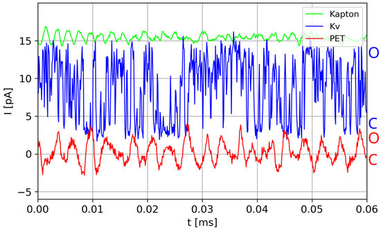 When measured [] with identical apparatus and in identical conditions, ions flow through a polymer PET (soft matter) nanochannel with charged dangling ends inside the pore, exhibiting typical O/C sequences, whereas currents flowing through a similar nanochannel made from Kapton film (hard, glassy polymer) are stationary in the wide sense. Published data [,,] concerning the geometrical structures of biological and viral nanochannels together with fragmentary data, on the atomic scale, of the main parts of these channels (responsible for its conductivity and selectivity) show that in the inside of these channels, there are similar substructures as in the PET channels, i.e., sticking charged fragments of peptides forming the channel.