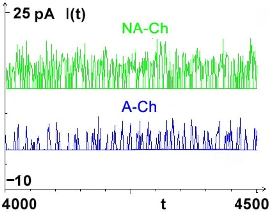 To keep with the physical reality in which biochannels work, all parameters, both those written explicitly in Equations (1)–(5) and others used throughout modelling/computations, are allowed for higher or lower fluctuations. These, though, usually do not influence the general interpretation of the results or change the details, in particular, the shapes of macro-trajectories of registered series of currents {I(t)}, as presented in Figure 1.