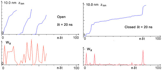 A “value-added” aspect of this project is the possibility of the visualization of nanoscale tracks of single ions passing through the channel under various channel situations (“Open” vs. “Closed”), reactions on unexpected external disturbances that affect the geometry, charge, or other characteristic pore parameters that affect the ionic transport (cf. Ref. []). Such information cannot be directly found experimentally.