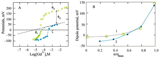 78]. At present, this circumstance does not allow using simple methods to compare the changes initiated by them in the charge and potential distribution on the membrane surface and its vicinity with the number of adsorbed molecules, as was carried out for the adsorption of small molecules and ions. Moreover, their adsorption can be accompanied by a change in the conformation of the molecules themselves or by independently constructing such models in a highly simplified form for further calculations of the surface dipole reorientation, as a result of the monomer–dimer equilibrium [