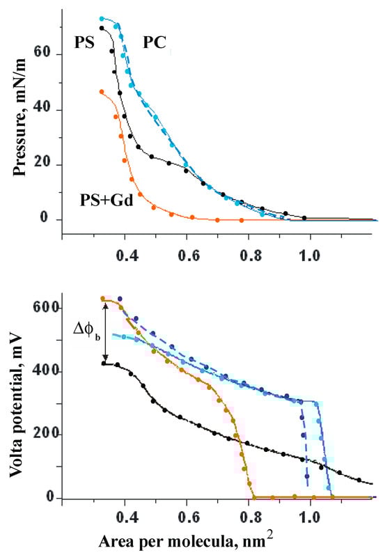46]. It is important to note here that, judging by the MD data, adsorbed cations affect the orientation of the polar groups of the lipid and a number of free or oriented water molecules at the interfacial boundary. It was found that, when lipid molecules passed to the compact packing, the dipole component of the boundary potential decreased as the number of adsorbed cations increased and, accordingly, changes in the surface potential move in a positive direction. In particular, the jump in the Volta potential, which is recorded in experiments on compression of a DMPS monolayer in the phase transition region, can be attributed to the loss of several water molecules and, for this reason, a change in the orientation of the ionized hydrocarbon chains of the lipid.