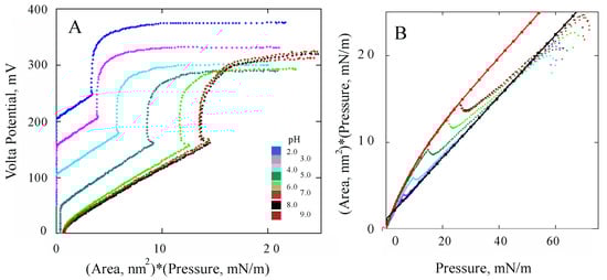 64]. The presence of an excess charge in polar groups, of course, requires a greater lateral pressure for such an approach by the molecules. This study greatly improves the understanding the relationship between electrostatic phenomena and the structure of the lipid–water interface.