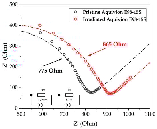 Nyquist plot of two membranes: Aquivion® E98-15S (standard) and Aquivion® E98-15S (irradiated) and the fitting (dash-dotted line) with the equivalent circuit (inset).