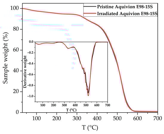 TGA and DTG (inset) graph of pristine and irradiated Aquivion® E98-15S membranes.