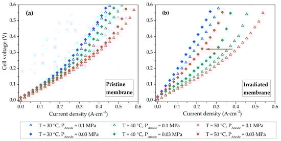 For the pristine membrane, the influence of hydrogen pressure at the anode does not have a significant effect on the EHP efficiency; with increasing temperature, the current increases because of the improved electrocatalyst activity and membrane conductivity (Figure 4a). For the irradiated membrane, the effect of pressure at the anode and temperature is more pronounced because of water balance disturbance in the membrane volume (Figure 4b). At a temperature of 50 °C and a pressure of 0.03 MPa, the efficiency of the EHP cell with the irradiated membrane decreases due to its more intense drying, which can be explained by the enhanced evaporation of water and increased vapor diffusion rate, causing dehydration of the membrane [8,49], as well as by low water retention ability of the irradiated membrane.