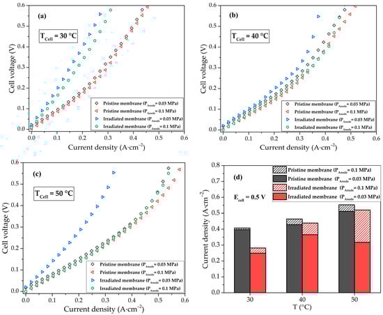 I-V curves of the EHP cell with pristine and irradiated membranes at 30 °C (a), 40 °C (b), 50 °C (c), and the EHP current density at the cell voltage of 0.5 V (d).