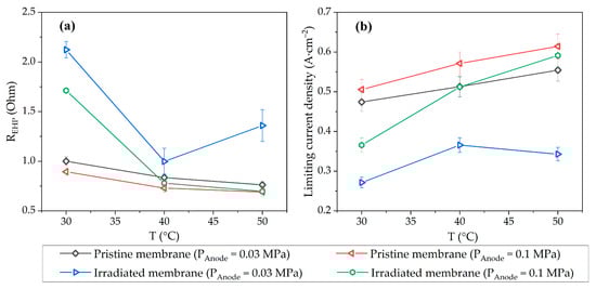 As a result of the description of the experimental data with the model curve, the values of the ohmic resistance of the EHP cell and the limiting current characterizing mass transfer effects were obtained (Figure 6). At temperatures of 40 and 50 °C, the values of these parameters turn out to be almost the same within the measurement error for the original membrane for all pressures under consideration and for the irradiated membrane at a pressure of 0.1 MPa. Thus, in the case of an irradiated membrane, an increase in temperature makes it possible to minimize the effect of irradiation on the membrane conductivity associated with the replacement of part of the -SO3H with -OH and -COOH groups. However, at low pressure, it is necessary to stabilize the water balance of the cell to prevent drying of the membrane, in particular, by adding hydrophilic inorganic fillers into the membrane [51,52] or catalyst layer [53].