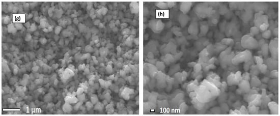 Figure 3 displays the SEM results of the Nafion® 117 membrane and crosslinked PVA-ZrP and Nafion®/PVA-ZrP nanocomposite membranes. The Nafion® 117 membrane is dark and free of nanoparticles, as shown in Figure 3a,b. According to Figure 3c,d, ZrP nanoparticles are well distributed throughout the linear PVA homogeneous phase. As shown in Figure 3c,d, the agglomerated nanoflakes of various sizes seem to take the shape of small nanorods inside the membranes. This might be because zirconia phosphate in nanoflake shape was well incorporated into the membrane during the process of recasting the crosslinked PVA membrane. The crosslinked Nafion®/PVA-ZrP appears to be remote in Figure 3e,f, because the PVA’s -OH groups are already used to create crosslinks and are therefore unavailable to create hydrogen bonds. It can also be seen that the ZrP nanoparticles are well dispersed within the Nafion/PVA matrix because they appear diffused and there is no obvious interface boundary between the matrix and the dispersed phase [12]. SEM results of ZrP nanoparticles are shown in Figure 3g,h. As seen in Figure 3g,h, the SEM image of ZrP nanoparticles reveals a spherical and nanoflake shape with less agglomeration in the size range of 100–150 nm. Furthermore, zirconia phosphate nanoparticles that are nanometres in size can be used in nanocomposite membranes to enhance the proton conductivity and decrease methanol permeability, which makes them more appropriate for use in PEMFCs.
