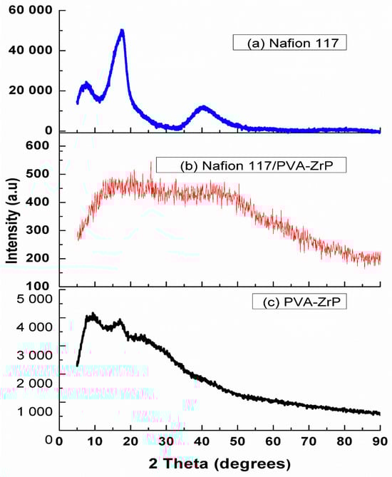 The XRD patterns for the Nafion® 117 membrane and PVA-ZrP and Nafion®/PVA-ZrP nanocomposite membranes are shown in Figure 5 [12]. Figure 5a shows that the Nafion® 117 membrane has two diffraction peaks at 17.5° and 39° 2θ, which can be assigned to the semi-crystallisation of the ionomer’s perfluorocarbon chains [13]). In the case of the blended PVA with Nafion® membrane incorporated with 5 wt.% ZrP, it show a slight shift at a peak of 20.8°, which correspond to planes (2 0 0), as shown in Figure 5b [14]. The presence and weight percentage of ZrP nanoparticles may be responsible for the observed shift in the main chain of the PVA and Nafion® membrane, resulting in a more amorphous structure. The findings from TGA and SEM further support the modifications to the membrane structure. Figure 5c shows the PVA-ZrP results, which exhibit the single scattering peak characteristic of PVA with a sharp peak at a 2θ value of 19.4° [12]. The weak peak at 2θ of 24.9 ° is attributed to the presence of crystalline peaks of ZrP, as shown in Figure 5b,c. The crosslinked nanocomposite membranes display a small peak of 2theta = 20.8. This may be due to the incorporation of ZrP nanoparticles.