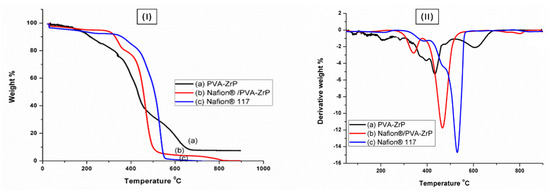 (I) The TGA and (II) DTG of PVA-ZrP and Nafion®/PVA-ZrP nanocomposite membranes and Nafion® 117 membrane.