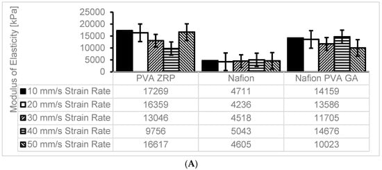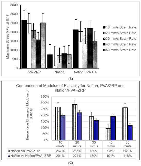 (A) Modulus of Elasticity at different strain rate for PVA-ZrP, Nafion® and Nafion®/PVA-ZrP. (B) Maximum stress (kPa) computed at different strain rate for PVA-ZrP, Nafion® and Nafion®/PVA-ZrP. (C) Comparison percentage comparison of Modulus of Elasticity for PVA-ZrP, Nafion® and Nafion®/PVA-ZrP.