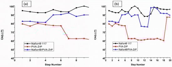 The water contact angle of the commercial Nafion® 117 membrane, PVA-ZrP and Nafion®/PVA-ZrP nanocomposite membranes were observed. The water droplets at the surface area of the nanocomposite membranes compared with the commercial Nafion® 117 membrane is presented in Figure 8a,b. The increases water contact angle is related to the hydrophobic characteristic of Nafion® 117 membrane, due to the presence of the sulphonic acid group in the hydrophilic side chain. As indicated in Figure 8a,b shows the higher water contact of 94° for Nafion® 117 membrane compared with the reduced water contact of 85° and 69° for Nafion®/PVA-ZrP and PVA-ZrP nanocomposite membranes; this may be due to the hydrophilicity of zirconia phosphate nanoparticles and crosslinking. The decreased contact angles of nanocomposite membranes (below 90°), may due to the zirconia nanoparticles that are adsorbed on the surface of the membrane to enhance the hydrophilicity [23] and crosslinking process which reduces the ability of the PVA chains to dissolve in water [15]. Contact angles below 90 ° indicate the hydrophilic character of a material describing the water-uptake capability. A smaller contact angle less than 90° indicates good wettability and hydrophilicity, while a larger contact angle above 90° suggests poor wettability and hydrophobicity.
