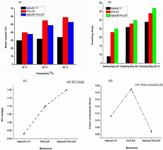 As shown in Figure 9b, measurements of the swelling ratio of the Nafion® 117 membrane and PVA-ZrP and Nafion®/PVA-ZrP membranes were made at 30 °C, 60 °C, and 80 °C. At 80 °C, the Nafion® 117 membrane and PVA-ZrP and Nafion®/PVA-ZrP nanocomposite membranes exhibit swelling ratios of 29%, 34%, and 37%, respectively. As shown in Figure 9b, these membranes expand as the temperature rises; so, as the temperature rises, the membranes tend to swell more. At a higher temperature of 80 °C, the Nafion® membrane blended with crosslinked PVA (Nafion®/PVA-ZrP) achieved a higher swelling ratio of 34% than the commercial Nafion® 117 membrane (29%), as shown in Table 2. This is because the chemically crosslinked PVA has a hydrogel-like quality and may indicate that this mix of materials is more susceptible to swelling at high temperatures [27]. As the temperature rises, these membranes experience an increased dimensional stability as well as an increased dimensional swelling and water uptake. This may indicate that as the temperature rises, the membranes can take up more water. The results in Table 2 show that the nanocomposite membranes (PVA-ZrP and Nafion®/PVA-ZrP) have a better dimensional stability compared to the Nafion® 117 membrane, particularly at higher temperatures of 80 °C. This improved stability might be due to the presence of ZrP nanoparticles within the composite structure.
