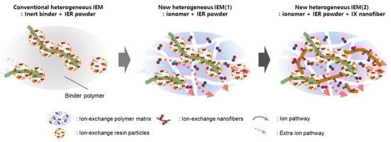 Meanwhile, ion-exchange membranes (IEMs) are key materials that determine the performance of electro-membrane processes such as CEDI [4,5,6,7], electrodialysis [4,8,9,10], reverse electrodialysis [11,12,13,14], Donnan dialysis [5,15], and fuel cells [5,13]. IEMs can be classified into anion-exchange membranes (AEMs), cation-exchange membranes (CEMs), and bipolar membranes (BPMs) depending on the types of fixed ion groups they contain [16,17]. IEMs are also divided into a homogeneous type, made solely of polymers attaching fixed charge groups, and a heterogeneous type, composed of ion-conductive resin powder and inert polymer binder [5,8,10,15]. Homogeneous IEMs offer the advantages of low electrical resistance and high permselectivity, but they also have disadvantages, including low mechanical strength and high production costs [8,10,15]. In contrast, heterogeneous IEMs are cost-effective to produce but face challenges such as relatively high electrical resistance (low ion conductivity) and reduced permselectivity due to the intermittent connectivity of the conductive regions [10,18,19]. Despite their inferior performance compared to homogeneous membranes, heterogeneous IEMs have found extensive use in various electrochemical systems, owing to their simple manufacturing process and cost-effectiveness [8,10,17]. Additionally, it has been reported that the heterogeneity of membrane surfaces promotes the onset and growth of electroconvection, enhances ion transport, and reduces fouling, among other benefits. Consequently, there is considerable potential for improving the performance of heterogeneous membranes [18,19].