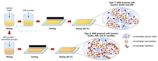 To prepare the heterogeneous AEMs, we formulated mixture solutions with various compositions. These solutions were then cast onto a glass substrate to form films with a thickness of 240 μm. The films were vacuum-dried at 60 °C for over 6 h. NMP was used as the solvent in preparing the casting solutions, and the quantities of ionomer binders (prepared at different TMA/BPPO ratios) and QPPO nanofibers were carefully adjusted. The membrane fabrication process is schematically illustrated in Figure 3.