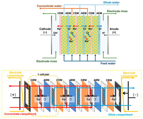 Continuous electrodeionization (CEDI) is a hybrid separation process that combines electrodialysis (ED) and ion exchange processes for producing ultrapure water [1,2,3]. The CEDI has the special feature of maintaining the ion conductivity of the solution, even at low concentrations, by filling compartments with ion-exchange resin (IER or IX resin). Since IER is continuously regenerated through water dissociation during operation, it can be environmentally friendly and economically advantageous compared to conventional ion exchange processes that require laborious chemical regeneration [2,3].