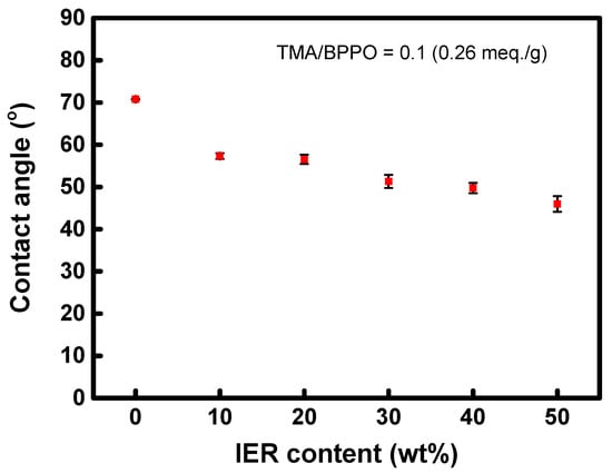 The surface contact angle results of the heterogeneous AEMs prepared with a TMA/BPPO molar ratio of 0.1, as a function of the IER content, are illustrated in Figure 7. As the hydrophilic IER content increases, the contact angle on the membrane surface tends to decrease gradually, indicating an elevation in the membrane’s surface hydrophilicity. This increase in surface hydrophilicity is beneficial as it can reduce ion transfer resistance at the interface and enhance the efficiency of water splitting. In comparison, the contact angle of the commercial membrane, IONAC MA-3475, was measured at 58.06°. This finding suggests that the fabricated membranes exhibit higher surface hydrophilicity than the commercial membrane under all tested fabrication conditions.