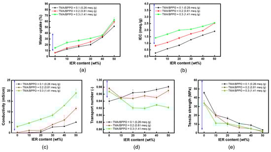 (a) Water uptake, (b) ion-exchange capacity, (c) conductivity, (d) tensile strength, and (e) transport number of heterogeneous membranes prepared with different IER contents (the blue double arrow indicates the appropriate range of membrane performance parameters determined based on the literature review).
