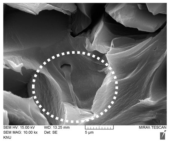 Cross-sectional SEM image of heterogeneous AEM prepared with ionomer binder and IX nanofiber additive (dashed circle indicates IX nanofiber).