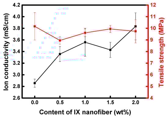 Ion conductivity and tensile strength of heterogeneous AEMs according to IX nanofiber content.