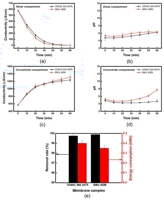 CEDI performances of commercial and prepared heterogeneous membranes: (a) conductivity and (b) pH of the dilute compartment, (c) conductivity and (d) pH of the concentrate compartment, and (e) removal rate and energy consumption.