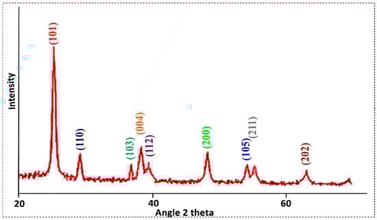 The average particle size was found to be 42 nm and K is an integer which is given as 0.89. λ is the wavelength of the X-ray radiation (CuK = 0.15 nm). Farbod and Khademalrasool [45] and Salari and Marashi [46] reported average crystalline sizes for TiO2 of 37 nm and 15 nm, respectively, by adopting mechano–chemical syntheses. XRD data of titanium dioxide nanoparticles have been reported in previous publications with consistent findings; these nanoparticles have been successfully used to produce biodiesel from a variety of nonedible feedstocks [47,48,49].