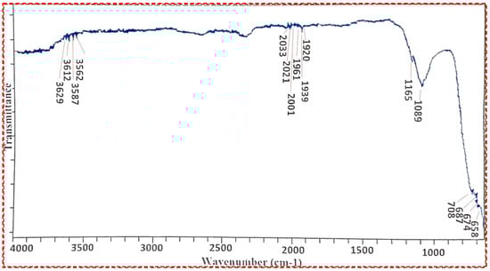 In several fields, such as organic synthesis, polymer science, petrochemical engineering, pharmaceutical manufacture, and food analysis, FT-IR spectroscopy serves as a remarkably advanced tool for process monitoring, compound identification, and mixture component determination [54,55]. In the FT-IR spectra, the weak bands between 3629 cm−1 and 1920 cm−1 were visible and the weakness in the bands was attributed to the absence of any impurity (Figure 5). However, the strong bands at 658 cm−1 and 708 cm−1 clearly indicate the presence of Ti-O-Ti vibrations during the stretching of titanium dioxide nanocrystals. Our results are in close accordance with those of Thakur et al., 2019 [56].