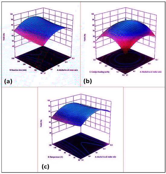 Response surface plots of Azidhiracta indica biodiesel: (a) alcohol–oil molar ratio and reaction time; (b) alcohol–oil molar ratio and catalyst loading (%); (c) alcohol–oil molar ratio and reaction temperature.