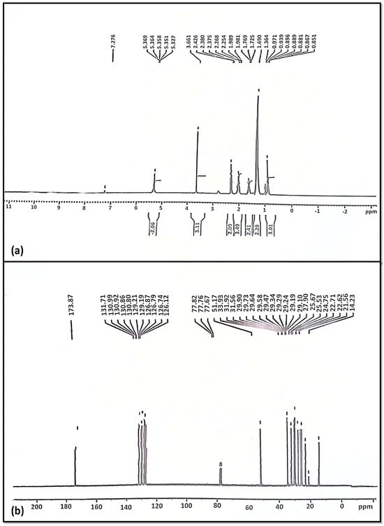 1HNMR spectroscopy is considered to be a simple and fast analytical technique; it yields information on all components of a mixture in one spectrum, usually without derivatization or destruction of the sample. The actual existence of a methoxy proton (–OCH3) was established by the distinctive singlet signal at 3.661 ppm [68]. Our results coincide with previous research, where 3.6 ppm singlet has been reported to be a characteristic peak in 1HNMR biodiesel [69,70]. Furthermore, peaks ranging from 2.254 to 2.426 ppm of α-methylene proton (–CH2) have been determined in triplets. Various peaks in range of 0.851–0.971 ppm represent terminal methyl protons (CH3). The peaks for β-carbonyl methylene protons, ranging from 1.364 to 1.989 ppm, were a major indicator (Figure 8a). Signals of 5.327 ppm and 5.369 ppm supported the presence of olefinic hydrogen [71].