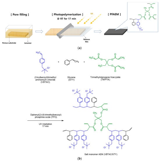 In this study, a porous film (Hipore, thickness = 25 μm, Asahi Kasei E-materials Co., Tokyo, Japan) composed of polyethylene (PE), which is used as a separator for the secondary batteries, was used as a substrate to prepare the PFAEMs. (Vinylbenzyl)trimethylammonium chloride (VBTAC) and styrene (STY) were selected as monomers to prepare the base AEM. In addition, trimethylolpropane triacrylate (TMPTA) was used as a cross-linking agent, and diphenyl(2,4,6-trimethylbenzoyl)phosphine oxide) (TPO) was chosen as a photoinitiator. Ethanol (EtOH) was used as a solvent that could dissolve all the components and was added at a weight ratio of 1/3 compared to the VBTAC monomer. The molar ratio of VBTAC and STY monomers was fixed at 1:1, and the contents of the cross-linker and photoinitiator were determined to be 10 wt% and 5 wt%, respectively, based on the total monomer weight. The porous substrate was then immersed in the prepared monomer mixture for 1 h. When the pores of the substrate were filled with monomer, it was inserted between the release films, rolled to remove excess monomer present on the film surface, and then cured using a UV lamp (TL-K 40W/10R, Philips, Amsterdam, The Netherlands) at room temperature for 5 min. The fabrication process of the pore-filled base membrane and the synthesis process of the anion-exchange polymer are shown in Figure 1. When the polymerization was completed, the release film was removed from the pore-filled membrane and stored in 0.5 M NaCl solution. All reagents used for the base membrane preparation were purchased from Sigma-Aldrich (St. Louis, MO, USA) and used without further purification.