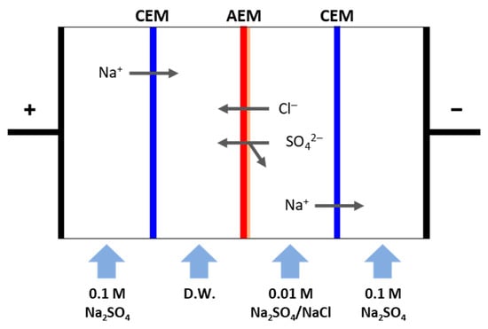 where and are the fluxes (mol/cm2·s) of Cl− and SO42− ions, respectively, and and are the concentrations (mol/L) of SO42− and Cl− ions, respectively, sampled in the concentration compartment. The cell configuration and principle of the 4-compartment cell used to measure the monovalent ion selectivity of the membranes are illustrated in Figure 4.