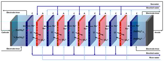Reverse electrodialysis (RED), one of the representative salinity difference power generation technologies using membranes, uses the concentration difference between seawater and river water as a driving force to selectively move ions through an ion-exchange membrane (IEM) and can generate electric power via the redox reactions that occur in the electrode compartments. In the RED process, efficient power generation is possible because chemical energy caused by the concentration difference in the solutions is directly converted into electrical energy [,,].
