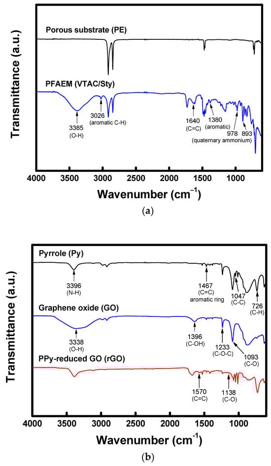 The FT-IR spectra of the porous support and prepared PFAEM are shown in Figure 6a. The spectrum of the PFAEM is significantly different from that of the PE support, and an O-H stretching vibration was confirmed at 3385 cm−1, which indicates the introduction of hydrophilic ion exchange groups into the polymer []. Meanwhile, an aromatic C-H bond was observed from the absorption band at 3026 cm−1 [], and a C=C bond and aromatic ring by VBTAC and STY were confirmed from the absorption bands observed at 1640 and 1380 cm−1, respectively [,]. The existence of the quaternary ammonium group bound to VBTAC was also confirmed by the absorption bands of 978 and 893 cm−1 [,]. Therefore, it could be confirmed that the anion-exchange polymer was well combined with the porous PE substrate.