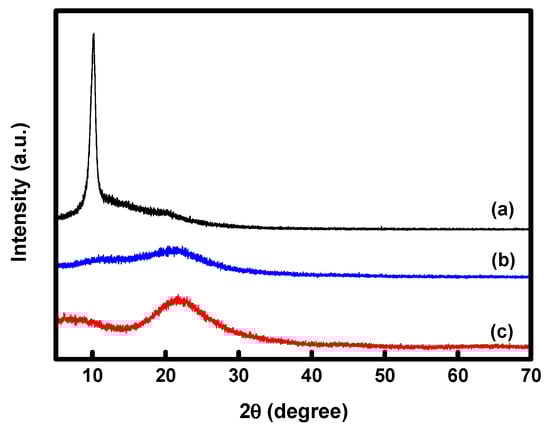 The XRD spectra of GO, PPy, and PPy/rGO are shown in Figure 8. The intrinsic diffraction peak of GO was confirmed at 2θ = 10.5° in the GO spectrum. Additionally, a broad peak was identified around 2θ = 21.6° in the PPy spectrum, representing the amorphous characteristics of PPy. In the spectrum of PPy/rGO, the sharp peak of GO observed at 2θ = 10.5° disappeared, and instead, a broad peak was observed around 2θ = 21.8°. This is similar to the peak identified from the spectra of PPy/rGO reported in the literature, demonstrating that GO was converted to rGO and PPy and rGO were completely integrated [,].