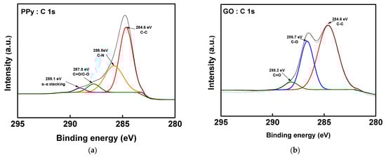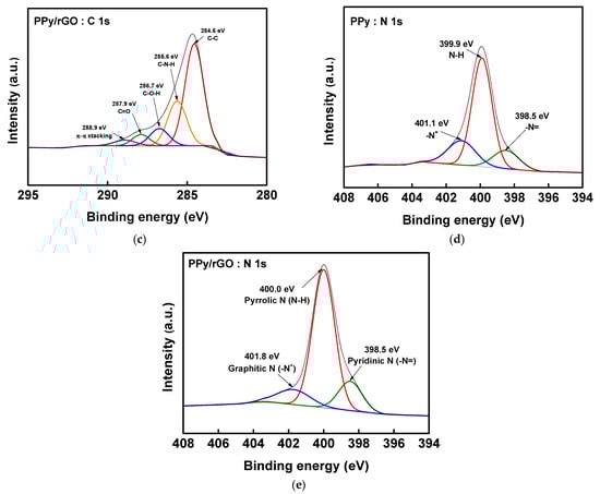 Figure 9a–c shows the C 1s spectra of the PPy, GO, and PPy/rGO composites, respectively. π-π stacking is a non-covalent interaction that occurs between pi bonds of aromatic rings and can occur between aromatic moieties of “PPy and PPy” or “PPy and rGO”, and this interaction can be confirmed through XPS analysis [,]. From the PPy spectrum in Figure 9), a peak indicating π-π stacking between the PPy molecules was confirmed at 289.1 eV []. Moreover, by comparing this to Figure 9b,c, it can be seen that the intensity of the C-O and C=O peaks appearing in the XPS spectrum of GO was greatly reduced in PPy/rGO, indicating the reduction of GO []. It could also be confirmed that PPy and rGO were combined through the C-N peak that appears at 285.6 eV in the PPy/rGO spectrum [,,,,]. The peak assigned to π-π stacking that appears at 288.9 eV in the spectrum of PPy/rGO indicates that the π-π interaction occurs between the PPy molecules or between PPy and rGO [,]. Figure 9d,e shows the deconvoluted N 1s spectra of PPy and PPy/rGO, respectively. The N 1s spectrum of PPy could be separated into the -N= peak of the imine nitrogen appearing at 398.5 eV, the N-H peak of the neutral amine nitrogen appearing at 399.9 eV, and the -N+ peak of the positively charged nitrogen appearing at 401.1 eV. In addition, from the spectrum of PPy/rGO, the peaks corresponding to a pyridinic nitrogen (-N=, at 398.5 eV), a pyrrolic nitrogen (N-H, at 400.0 eV), and a graphitic nitrogen (-N+, at 401.8 eV) were observed, demonstrating that PPy was bound to rGO [,,,,]. Meanwhile, in the N 1s XPS spectrum of PPy/rGO, all peaks shifted to a larger binding energy compared to PPy. This is believed to be mainly a result of π-π stacking and hydrogen bonding between rGO and PPy [].