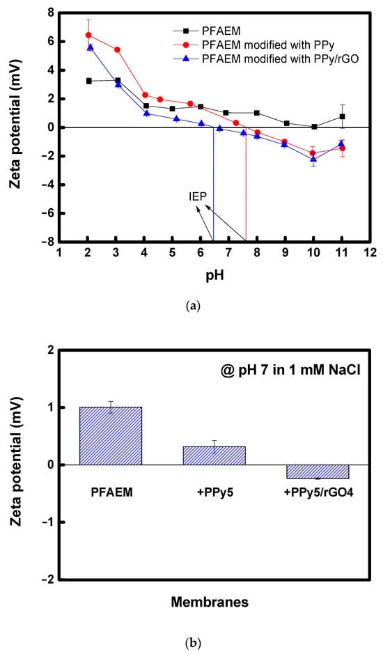 Zeta potential values of the prepared PFAEMs: (a) Zeta potentials according to the solution’s pH (the vertical dotted lines represent the IEPs.); (b) Zeta potentials at pH 7.