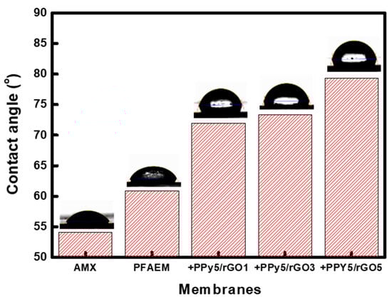 Meanwhile, the hydrophilicity of the membrane surface is a factor that significantly affects the ion transport characteristics through the membrane. In this study, the contact angle was measured to check the change in hydrophilicity of the membrane surface through surface modification, and the results are displayed in Figure 11. Among the samples tested, a commercial membrane (AMX, Astom Corp., Tokyo, Japan) showed the smallest contact angle (54°), meaning that it had the highest surface hydrophilicity. In comparison, the PFAEM showed a somewhat higher contact angle of approximately 61°. Since the surface of the PFAEM was completely covered by the ionomer, as shown in Figure 7b, this contact angle represents the intrinsic hydrophilicity of the pore-filled ionomer. With the introduction of the PPy/rGO layer on the membrane surface, the contact angle increased significantly, which was due to an increase in the density of the membrane surface and a decrease in the number of ion exchange groups. Moreover, as the content ratio of hydrophobic rGO increased, the contact angle increased, indicating that rGO had a significant effect on increasing the hydrophobicity of the membrane surface. The increased hydrophobicity by introducing the PPy/rGO layer could allow for a denser surface structure, increasing the sieving effect for multivalent anions with a relatively large hydration radius.