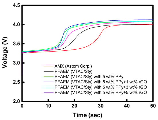Chronopotentiometric curves of AMX, unmodified PFAEM, PPy-modified PFAEM, and PPy/rGO-modified PFAEMs.