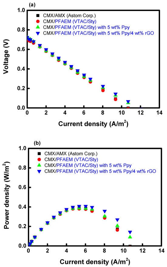 (a) Current-voltage and (b) current-power density curves of RED cells employing AMX, unmodified PFAEM, PPy-modified PFAEM, and PPy/rGO-modified PFAEMs, respectively.