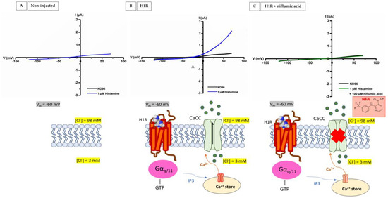 Several concentrations of histamine (Sigma-Aldrich, Rockville, MD, USA) (agonist) were used for the measurements and to make a dose–response curve for H1R, H2R, H3R, and H4R. In the experiments with pertussis toxin (PTX) (Sigma-Aldrich, Rockville, MD, USA), oocytes were incubated in ND96 solution containing 2.5 ng PTX for 16 h before measurements in order to check the blocking effect on the GPCR signaling. In niflumic acid experiments, H1R injected oocytes were continuously perfused with ND96 solution containing 100 µM niflumic acid (Sigma-Aldrich, Rockville, MD, USA), followed by ND96 solution containing 100 µM niflumic acid together with 1 µM histamine. Niflumic acid is a potent and reversible blocker of the calcium-activated chloride channels (CaCC). A total of 24 nM JNJ 7777120 (Sigma-Aldrich, Rockville, MD, USA) was used as a potent H4R antagonist.